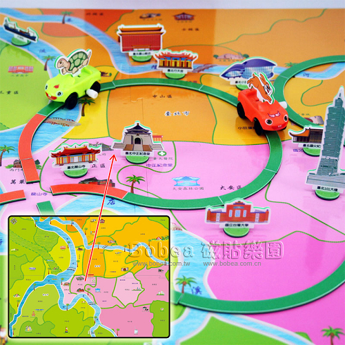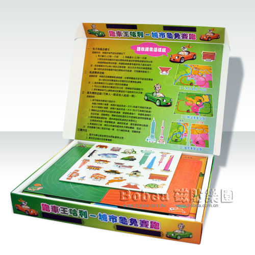有一天,寶兒的爸爸從Bobea磁貼樂園帶回了「跑車王哈利 DIY磁貼軌道賽車-城市龜兔賽跑」